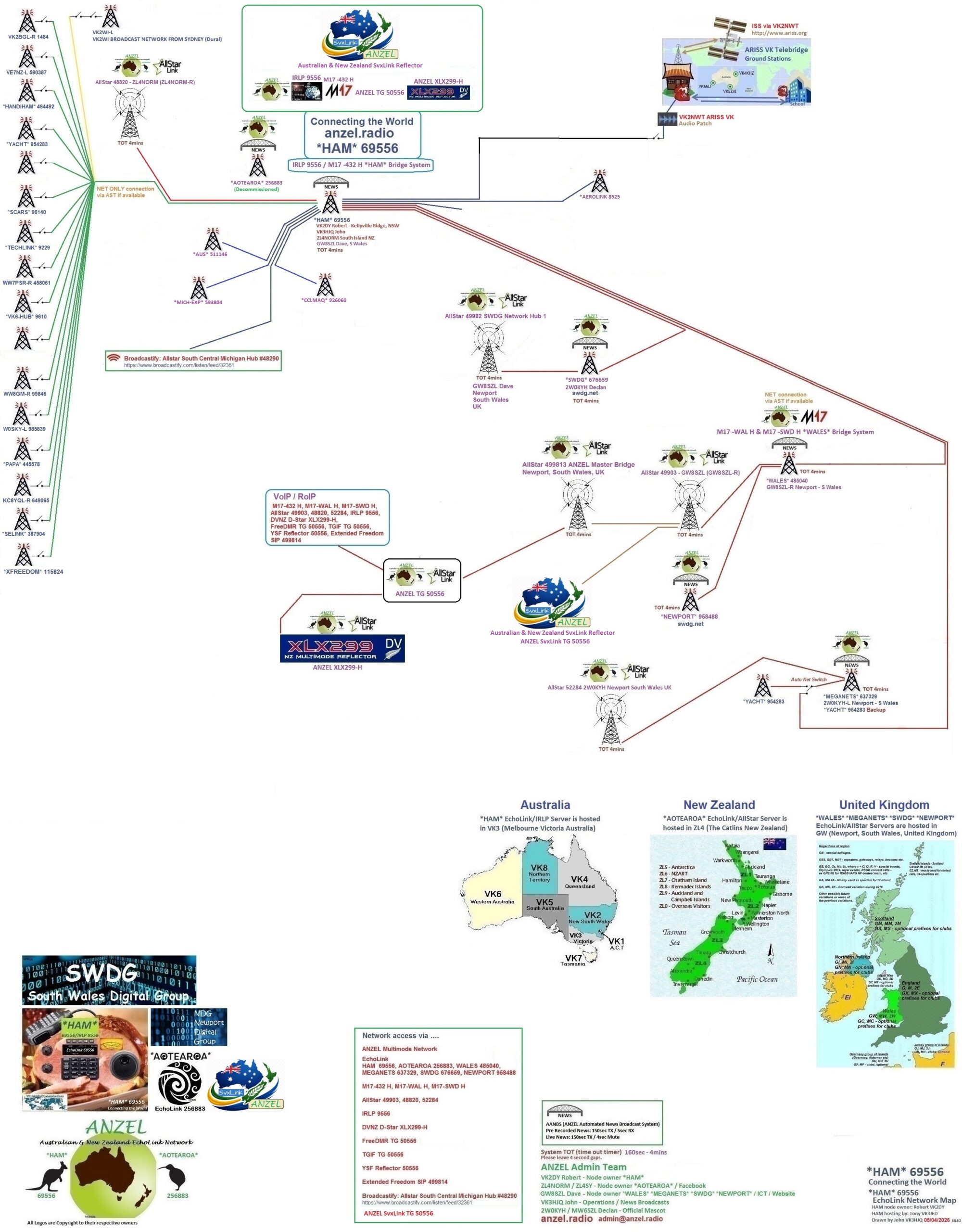 EchoLink *HAM* 69556, *AOTEAROA* 256883, *WALES* 485040, *MEGANETS* 637329, *SWDG* 676659, *NEWPORT* 958488, M17-432 H, M17-WAL H, M17-SWD H, AllStar 49903, 48820, 52284, IRLP 9556, DVNZ D-Star XLX299-H, TGIF TG 50556, FreeDMR TG 50556, YSF Reflector 50556, Extended Freedom Network DMR TG 50556 and the Extended Freedom Network SIP Portal 499814.